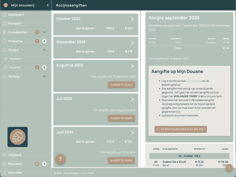 Iedere brouwerij is voor de douane verplicht om een precieze administratie te voeren over productie van alcoholhoudende dranken en over wanneer en hoeveel er de Accijnsgoederenplaats verlaat. Op basis van de uitslag van de goederen wordt de verschuldigde accijns berekend. BrouwBroeder zorgt er voor!