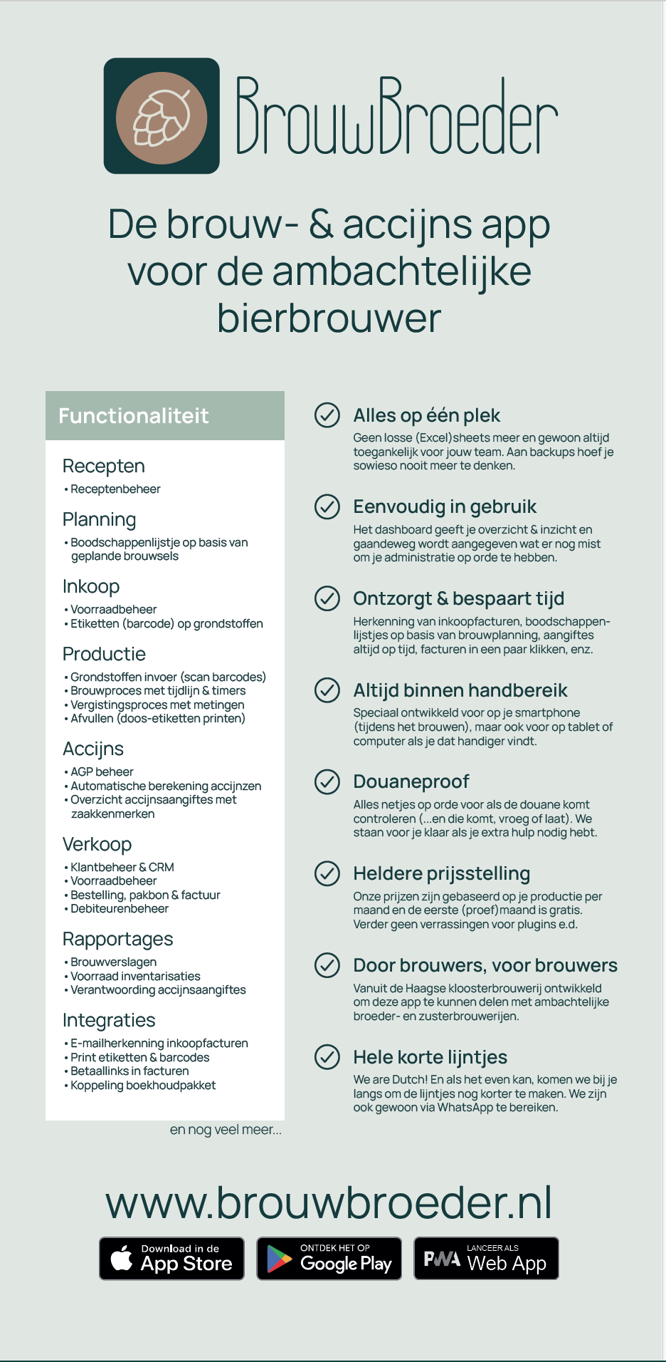 BrouwBroeder is brouwerijsoftware die speciaal is ontwikkeld voor kleine ambachtelijke brouwerijen in Nederland. In tegenstelling tot veel andere systemen, die zijn gebouwd voor grotere brouwerijen, richt BrouwBroeder zich op eenvoud, overzicht en gebruiksgemak.
